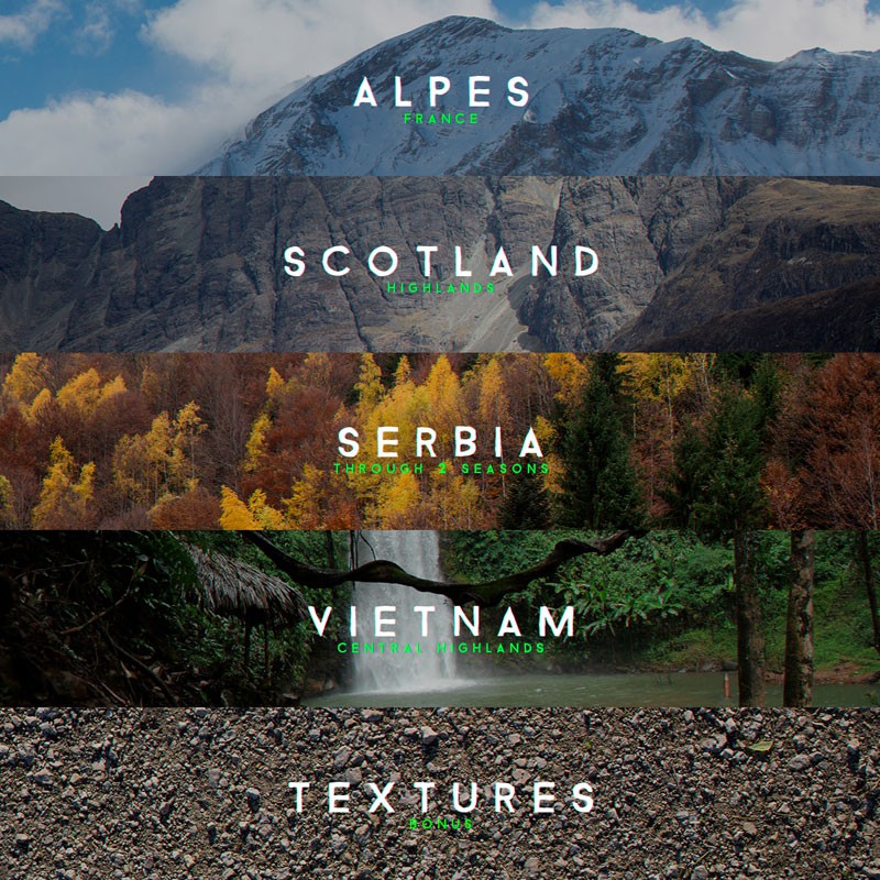 Snowy rocky mountains from France, rocky foggy hills from the highlands of Scotland, brilliant shades of red and orange of Autumn in Serbia, green vegetation from Vietnam, some bonus textures…He made this pack for matt painters or people who paint and use images, but the pack is free for other purpose !