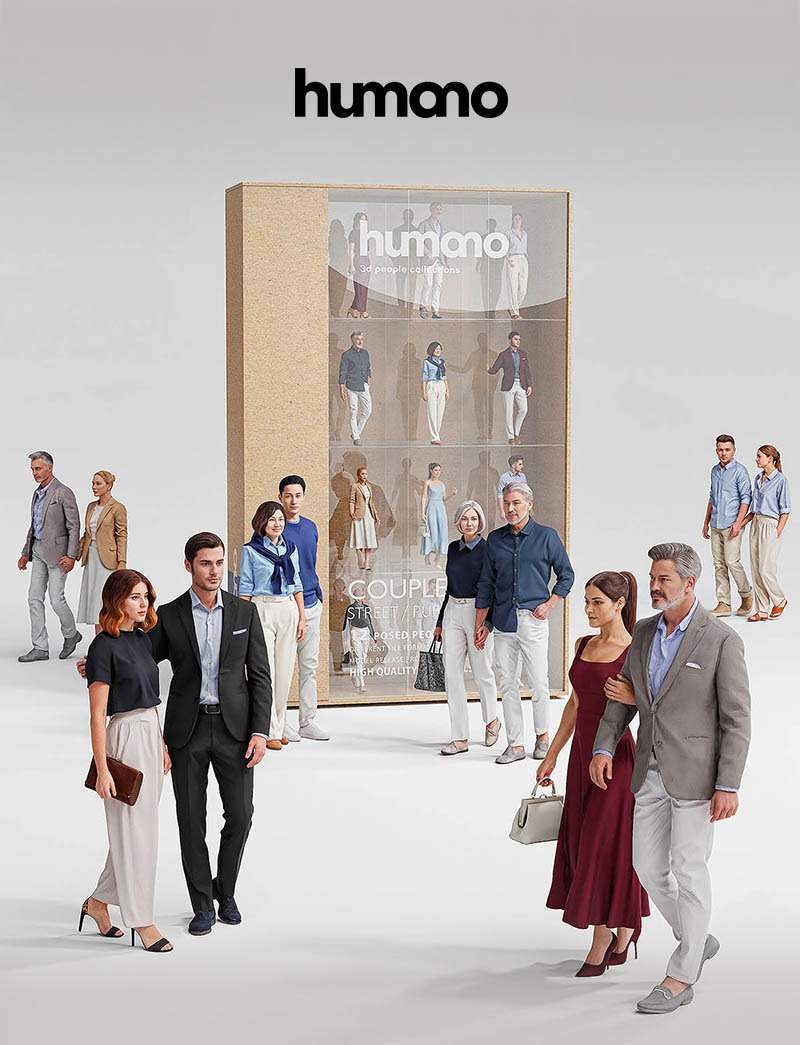 Discover 6 pairs of stylish 3D People walking & standing, dressed in modern, elegant, and smart casual outfits. Perfect for events, public spaces, residential, hospitality and lifestyle visualizations.
