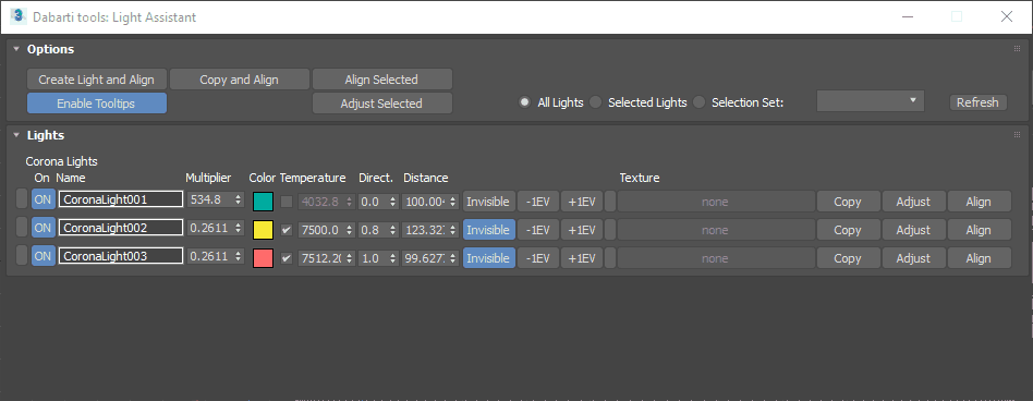 Light Assistant helps with aligning reflections and adjusting the parameters of V-Ray and Corona Lights.