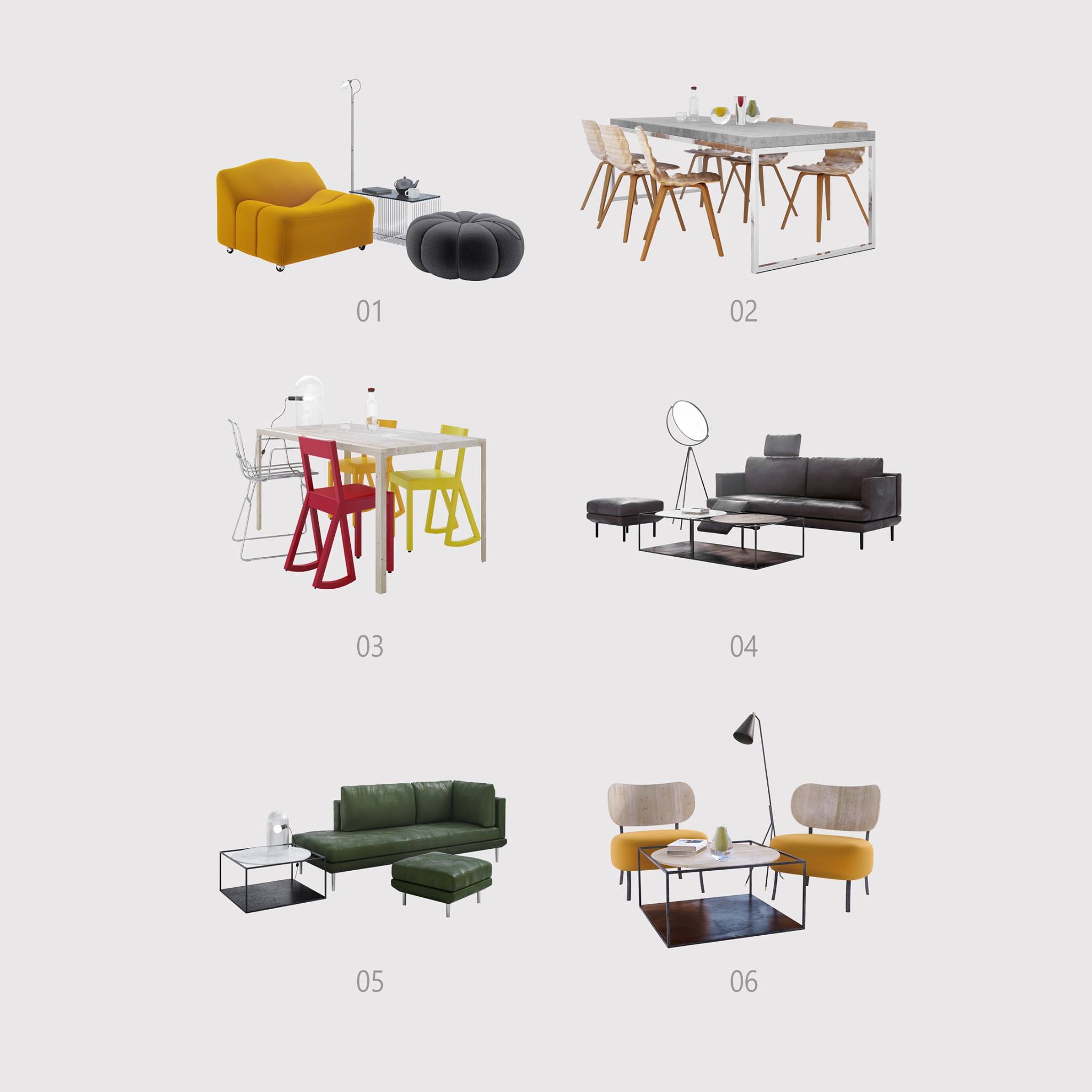 6 different furniture sets made using models from Design Connected, grouped, re-tweaked and re-vamped by yours truly GRAPHROOT.