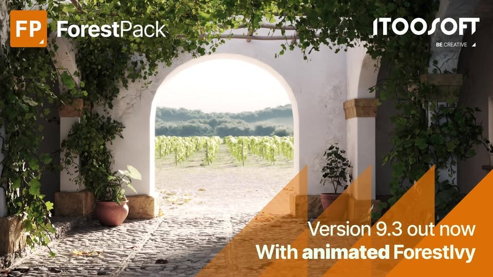 ForestPack 9.3 is now available, with handy updates to both ForestIvy and Scatter. This release introduces wind animation for climbing plants, tapered geometry for more realistic branches, a new branch rotation parameter, plus the ability to extend existing base lines.