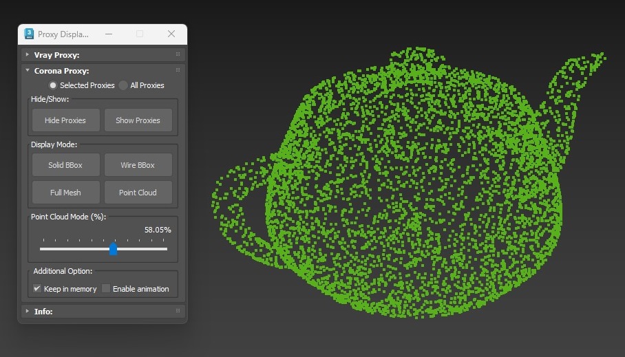 When working with heavy scenes containing dozens or hundreds of V-Ray or Corona proxies, manually adjusting proxy display settings can be time-consuming and repetitive. Proxy Display Manager streamlines this process by providing a centralized, easy-to-use interface to control how proxies are displayed in the viewport — saving time and keeping your scene responsive.