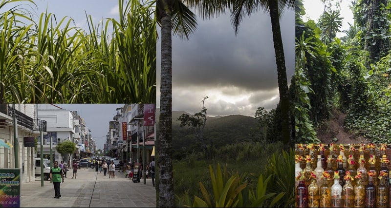 Includes shots of mountainous landscape, tropical waterfall, tropical forest, creole market, rhum distillery (…)