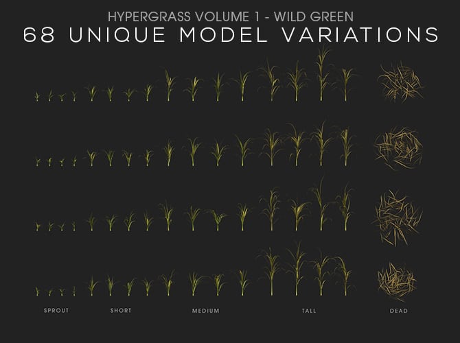 HyperGrass Volume 1 (Wild Green) is divided into 5 growth categories with a total of 68 unique model variations: