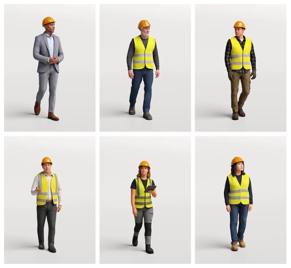 Bring safety and realism to your projects with 6 walking 3D people in workwear outfits, ready for construction, logistics, and industrial scenes. Collection includes 4 color variations, 3 LODs, and ready‑made groups for faster scene building.