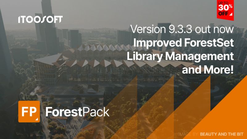 ForestPack 9.3.3 is out now and adds automatic texture relinking using your library’s folder structure, full control over where built-in libraries are installed, and an improved ForestSet plugin that can now be manually updated after layer changes or automatically when you need it. New right-click selection options or ForestSet and ForestLOD make navigating complex setups faster, with a handful of UI and stability fixes improving everyday work.