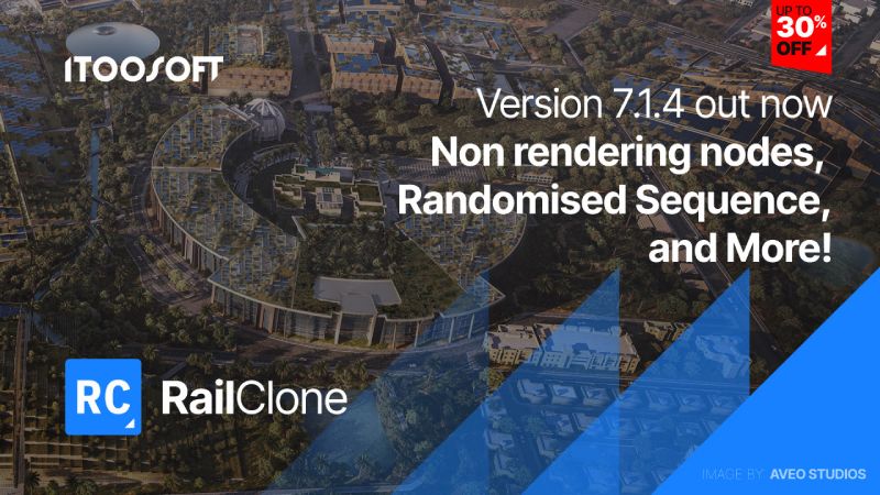 RailClone’s latest update adds non-rendering Segment and Transform nodes so you can use geometry for layout that doesn’t appear in the final render, a new Randomize Order and Count mode in the Sequence operator for more sophisticated pattern creation, expressions gain new attributes, and texture paths are now easier to manage with automatic relinking and support for UNC paths.