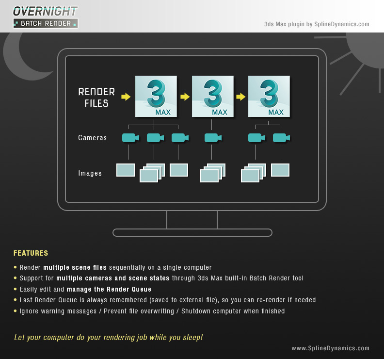 Overnight can handle multiple scene files, multiple cameras per scene and even different scene states, working together with 3dsMax built-in Batch Render tool.