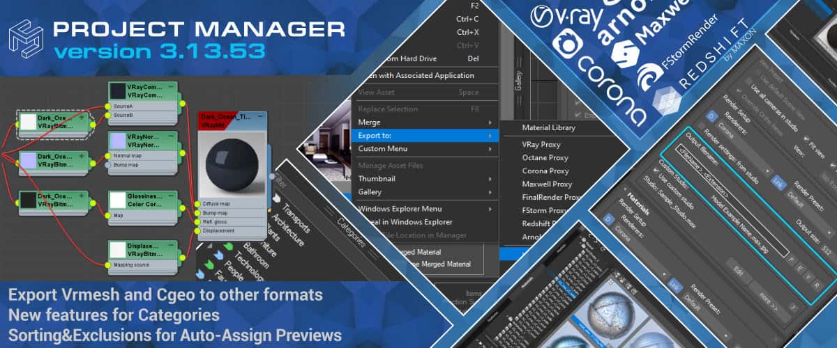 In this version, it is now possible to export .VRMESH (Vray proxy) and .CGEO (Corona proxy) files into other formats.