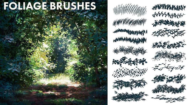 This brush set cleverly blends painterly brushes with crisp stylized shapes and rough textures to help you create fast environment concepts. This set was designed for virtual plein air painting and visual development but can be helpful to anyone who likes a graphic style with bold shapes and textures.