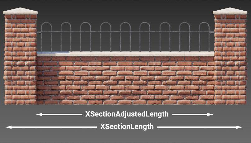 It differs from the existing XSectionLength and YSectionLength attributes because it allows you to fit Default segments (simple geometry or even nested generators) into the spline section without requiring you to manually take into consideration the size of adjacent segments. The illustration below explains the values that would be returned for the two attribute types for a wall with a pillar in the Start and End inputs