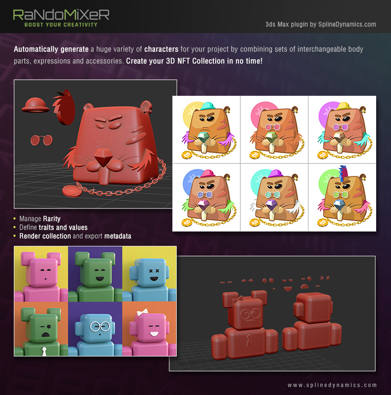 RandoMixer is a 3dsMax plugin to generate multiple unique variants or states of your scene, model or character from sets of different elements and manage them within a collection.
