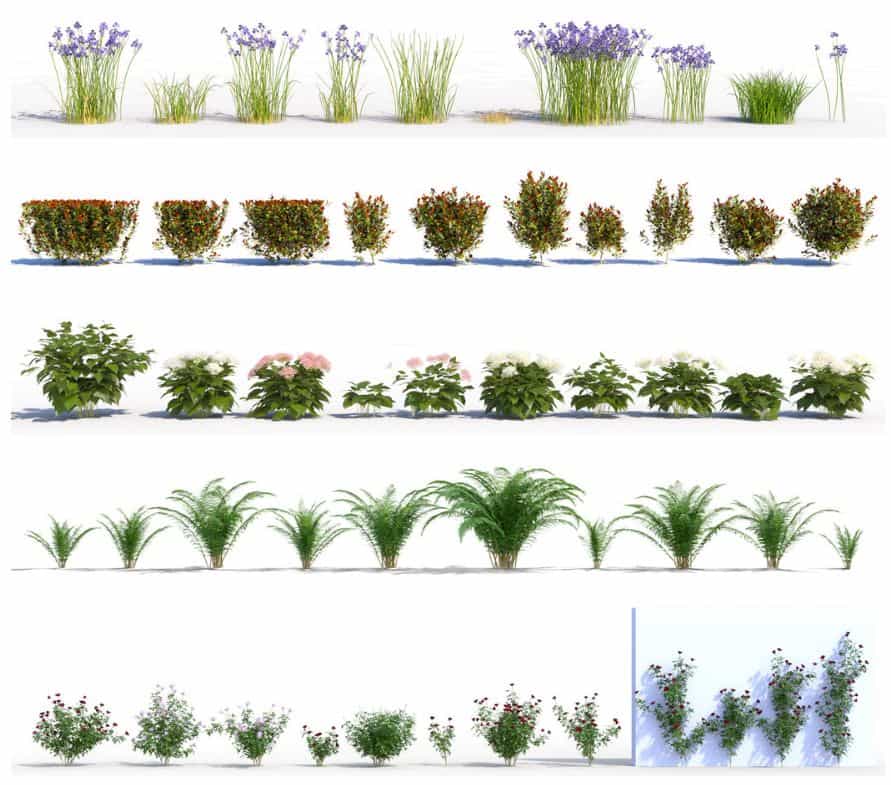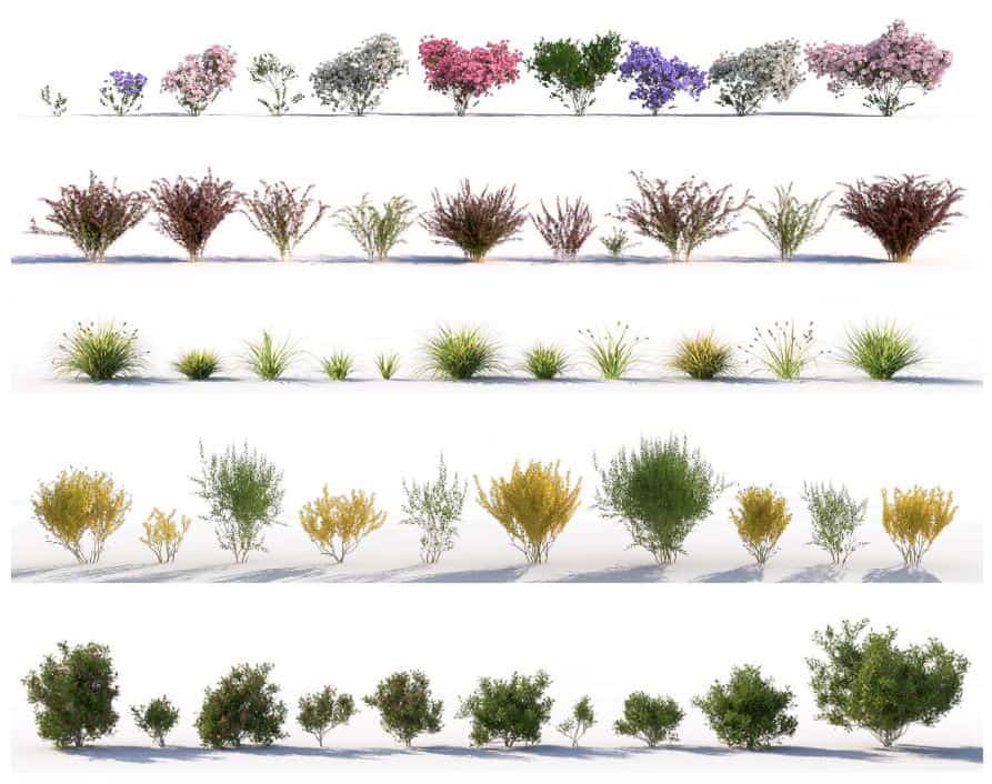 REAL SHRUBS is a highly realistic 3D shrub model library for architectural visualization. The library includes 10 different shrub species, each with several model variations to ensure realistic looks. All models are available as 3Ds Max scenes with support for vray, Corona, Octane, FStorm and scanline. The GrowFX version includes additional scenes for further variation, editing and animation using the GrowFX plugin from Exlevel. Real Shrubs is available for 3Ds Max, FBX, OBJ and GrowFX (including all files form the 3Ds Max version).