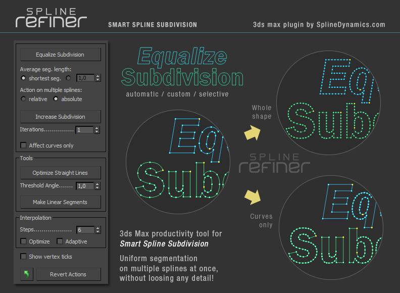 Spline Refiner is a 3dsMax productivity tool to fine-tune your spline shapes incredibly fast, in a simple and efficient way.