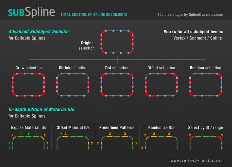 SubSpline is an Advanced Subobject Selector & Material IDs Editor for spline shapes in Autodesk 3dsMax.