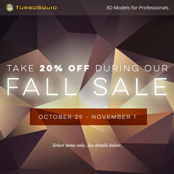 Join Turbosquid for our Fall Sale and save 20% on a huge selection of our catalog! Don’t wait- the sale ends on Wednesday at 12PM CDT.
