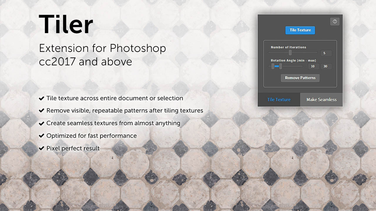Tiler is a Photoshop extension for tiling textures and creating seamless textures. Fast and easy to use.