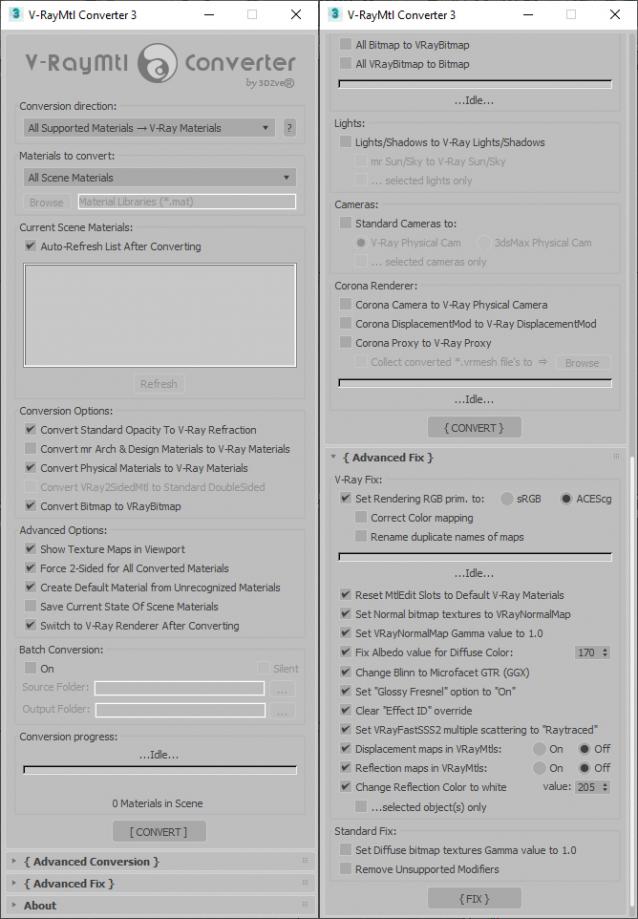 V-RayMtl Converter – the very useful professional tool for automating such a time-consuming process as converting of materials, maps, lights, cameras, proxy, modifiers etc. from different renderer engines (currently supported: Scanline (Standard), Raytrace, Autodesk Material, Architectural, mrArch&Design, Physical Material, Corona, NVIDIA iray (unofficial), fr-Advanced, Brazil Advanced) to V-Ray, as well as to reverse the conversion of V-Ray materials to Standard materials (which is very useful for game developers, 3d modelers, etc).